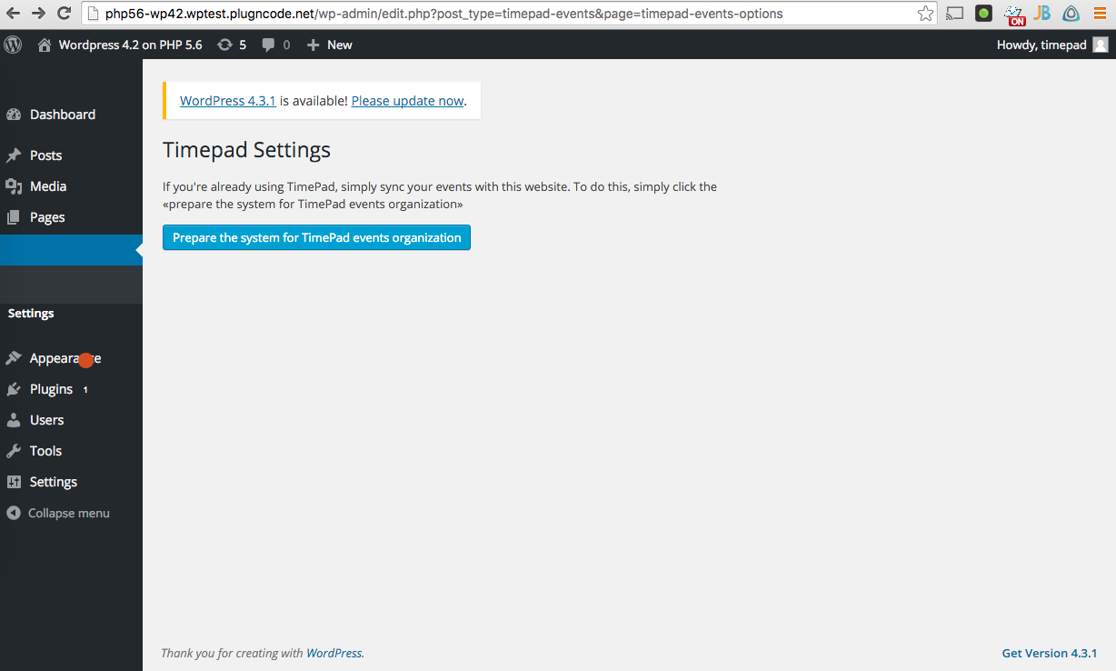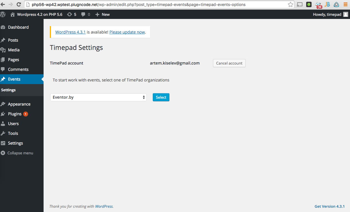 Как это выглядит в плагине для WordPress: при пустом списке организаций мы автоматически создаем на TimePad аккаунт с именем, равным имени блога и все события постим в эту организацию. То есть пользователю после регистрации не нужно ничего делать, все делается за него.
